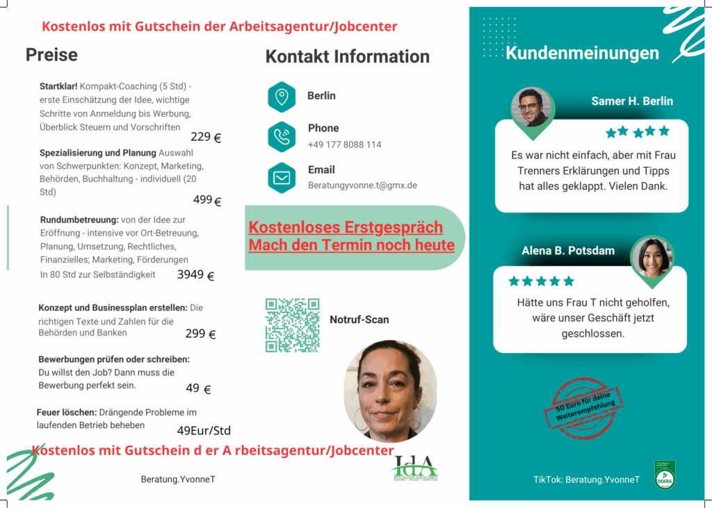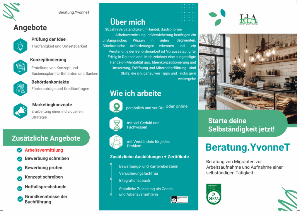 30 Jahre Erfahrung in der Selbständigkeit in Deutschland. Zusatzausbildungen als Integrationscoach, Versicherungsfachfrau, Bewerbungs- und Karriereberaterin und Ausbildung bei der Agentur für Arbeit